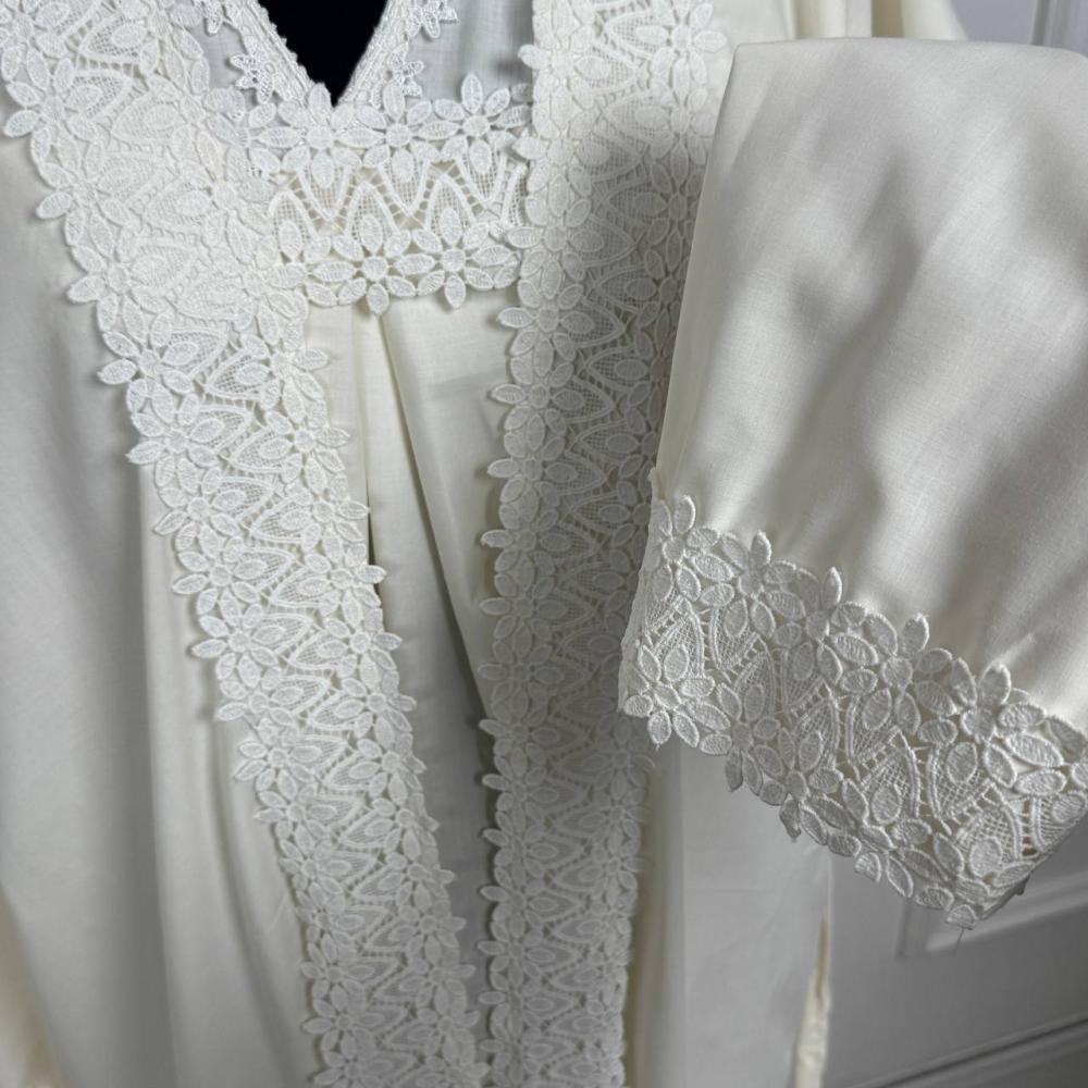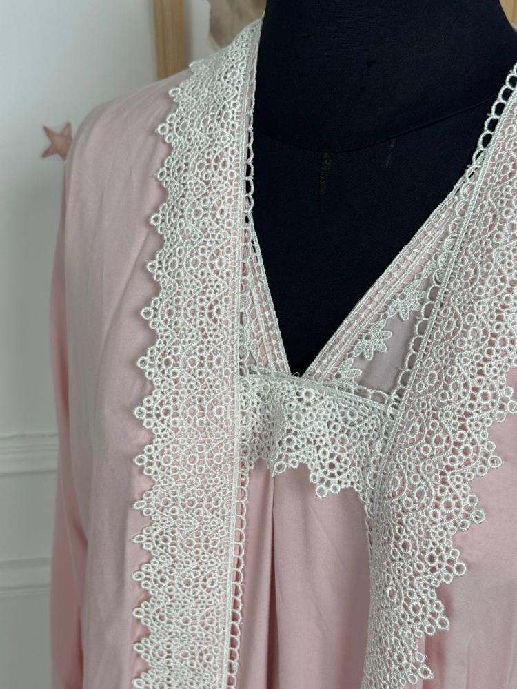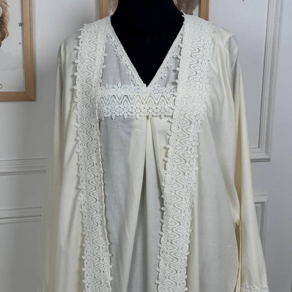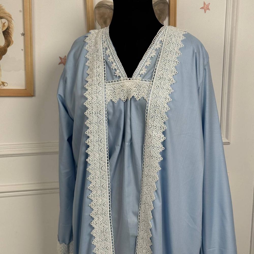 يتميز روب استقبال نفاس بأكمام طويلة مريحة وياقة مزينة بدانتيل مطرز بعناية مع شريط دانتيل يمتد من الصدر حتى أسفل الروب بالإضافة إلى حزام على الصدر أنيق