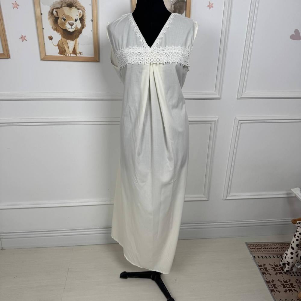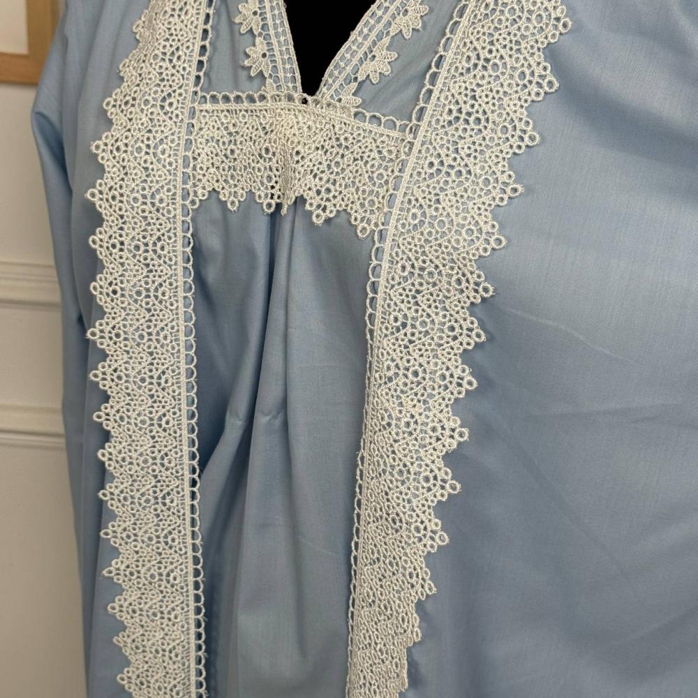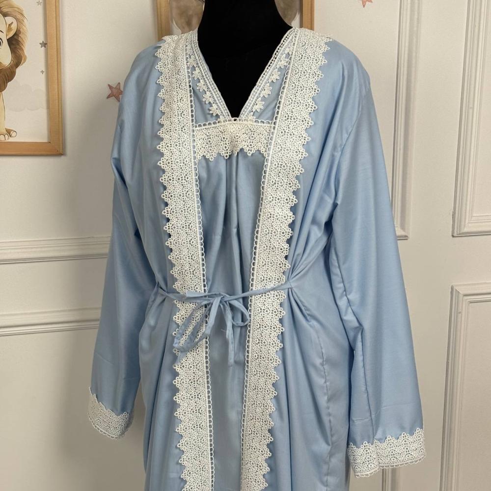 يتميز روب استقبال نفاس بأكمام طويلة مريحة وياقة مزينة بدانتيل مطرز بعناية مع شريط دانتيل يمتد من الصدر حتى أسفل الروب بالإضافة إلى حزام على الصدر أنيق