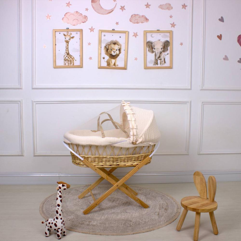 سلة موسى (خيزران خشبي) بتلبيسة قماش مقلم بيج
